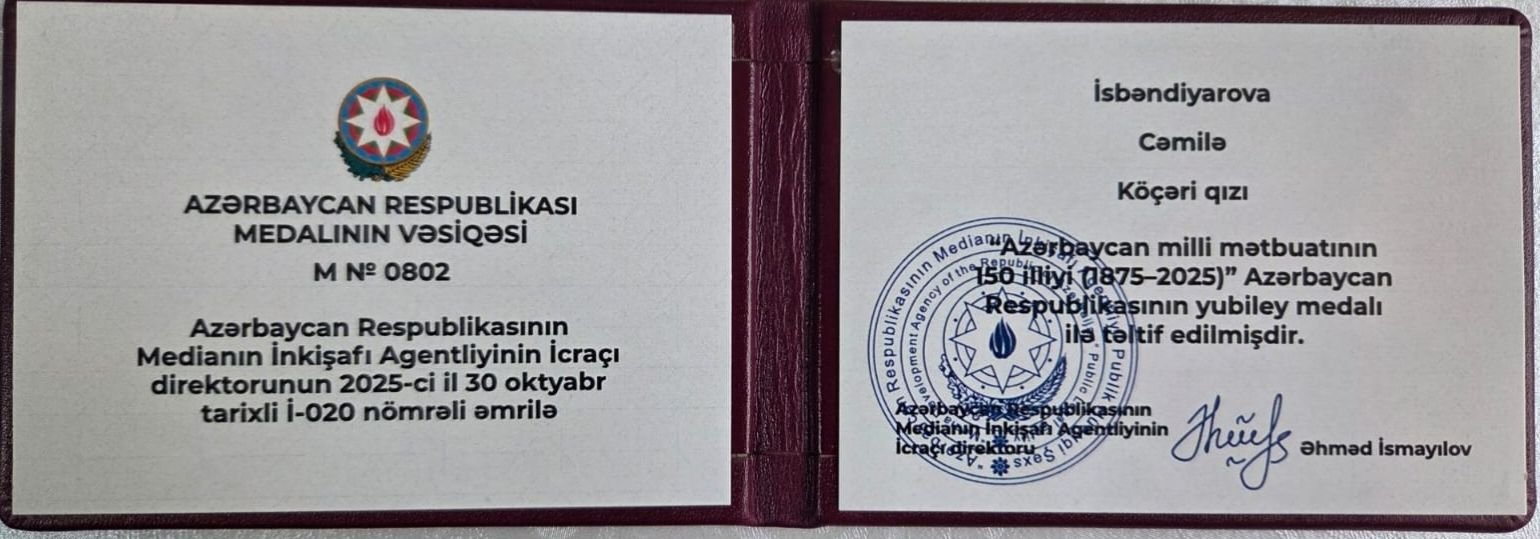 Bu gün mənim üçün sadəcə bir təltif günü deyil. Bu gün bir ömrün, bir taleyin, bir sükuta sığmayan ağrının və susmayan qələmin dövlət səviyyəsində eşidildiyi gündür. Azərbaycan milli mətbuatının 150 illiyi münasibətilə “Mətbuatın 150 illiyi” medalı ilə təltif olunmağım mənim üçün şəxsi sevincdən çox, mənə etibar edilmiş sözün, çəkilmiş zəhmətin və yaşanmış ağrıların dəyər görməsidir.