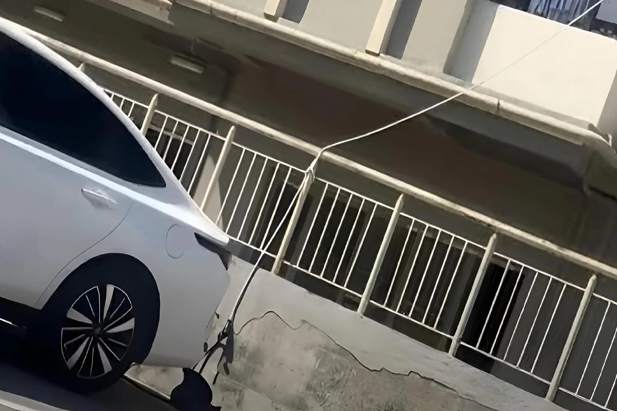 Belə ki, sürücü elektromobilini binanın 8-ci mərtəbəsindən endirdiyi elektrik naqili ilə enerjiyə qoşub.