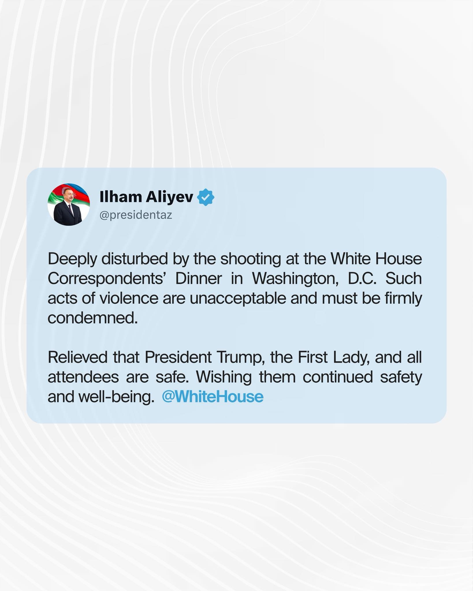 “Vaşinqtonda keçirilən Ağ Ev Müxbirləri Assosiasiyasının şam yeməyində baş verən atışma məni dərindən sarsıtdı”.“Qafqazinfo” xəbər verir ki, bu barədə Azərbaycan Prezidenti İlham Əliyev “X” sosial şəbəkə hesabında paylaşım edib.